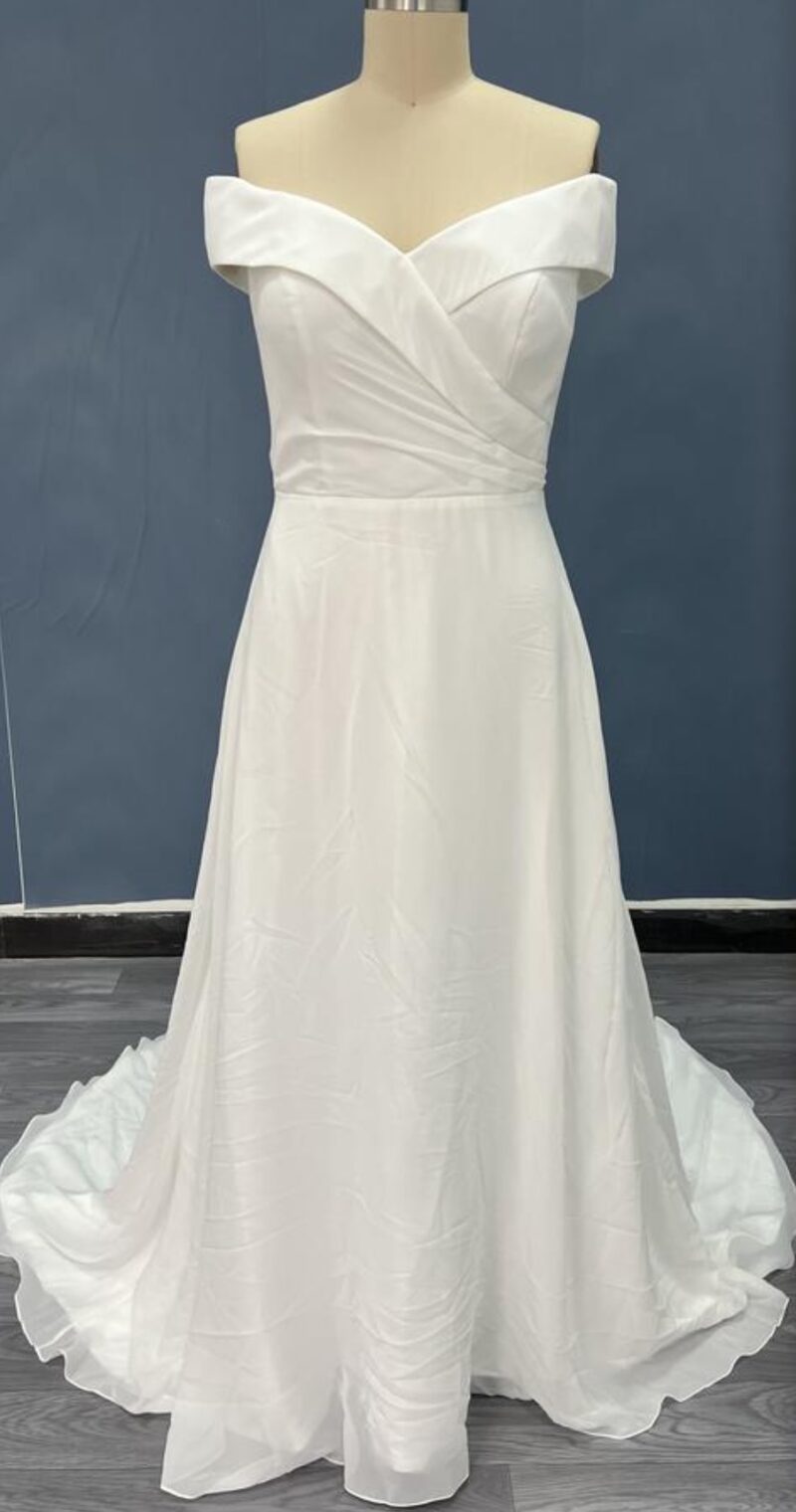Vestido de gasa, hombros caídos, botones en espalda y pequeña cola.
